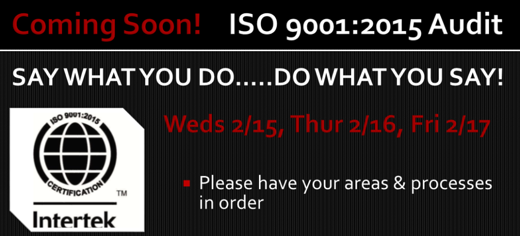 Wednesday, February 15th – Friday, February 17th – ISO 9001:2015 Audit at All plants