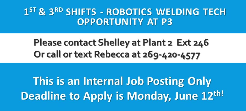 - HS Diploma, 3 yrs experience in Robotic welding position