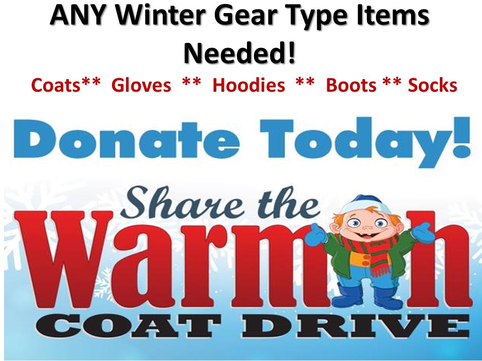 We will be kicking off our Winter Gear drive for the homeless, so if you have any winter items such as coats, gloves, hoodies, boots, socks etc.… Please bring them in!
