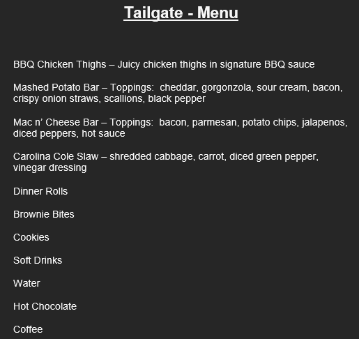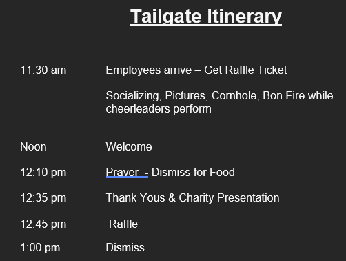 We look forward to seeing everyone tomorrow Friday, October 20 at 11:30 am! Attached is the Menu & Itinerary! Don’t forget to wear your team colors!